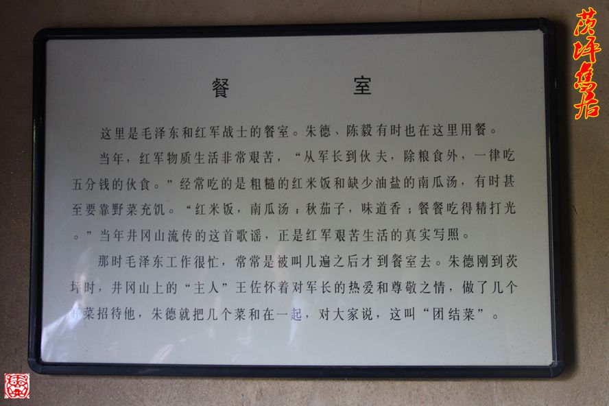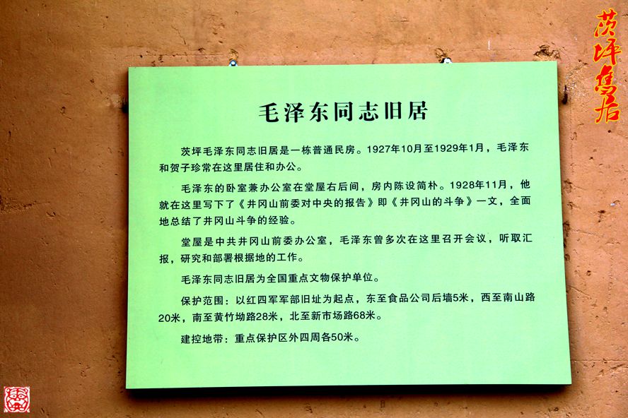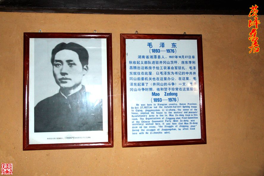 茨坪毛泽东旧居,坐落在茨坪中心的东山脚下,面临风姿秀丽的挹翠湖。这里原是一栋农民的住房。1927年10月27日,毛泽东率领湘赣边界秋收起义部队来到茨坪就居住在这里。到1929年1月的一年多时间里,毛泽东每到茨坪就在这栋房子的中厅右后间居住和办公。1928年11月6日重新组织的中共井冈山前敌委员会机关也设在这里。1929年1月14日,毛泽东率领红四军主力离开井冈山。这栋房子于1929年2月被国民党反动派烧毁,1961年重新修复,被列为国家重点文物保护单位。