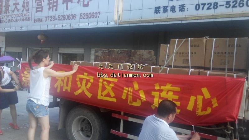 湖北景天集团今天又向灾区捐赠300件漂白消毒液、800件食用油、40台汽油机水泵机组。