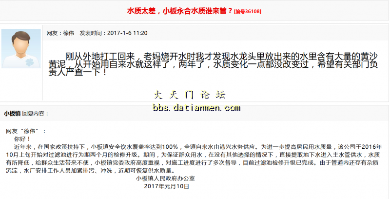 小板镇关于《水质太差,小板永合水质谁来管?》的回复