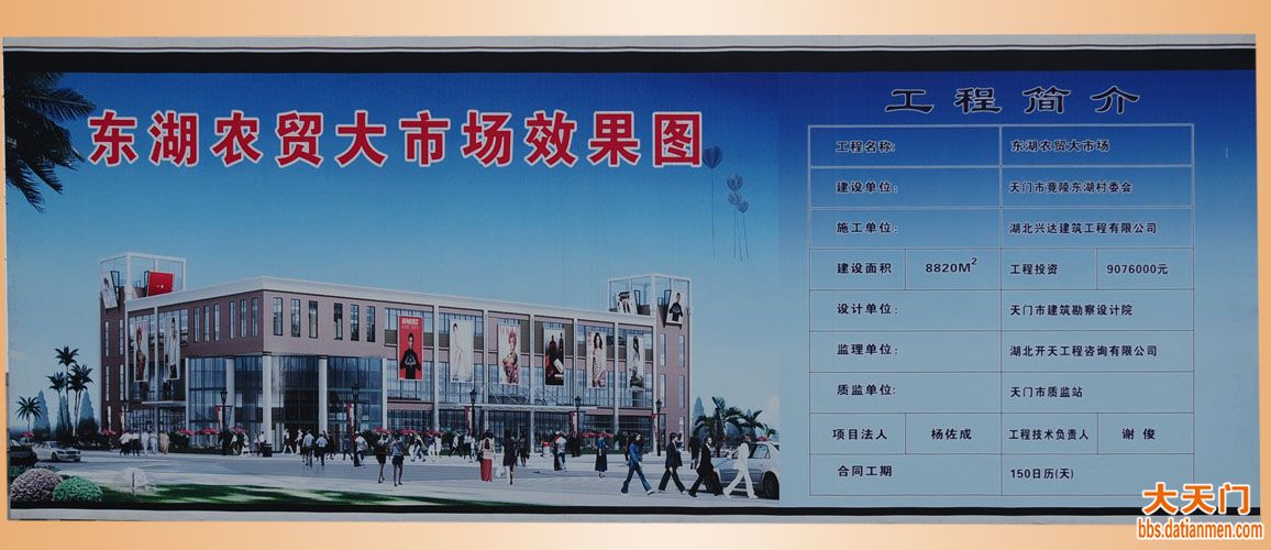 东湖农贸大市场位于纺织路东侧,即天门市水产肉禽冷链综合大市场,于2010年10月经天门市人民政府批准成立。市场占地面积170亩。第一批次已获准建设用地70亩;市场规划实行功能分区,分设标准化菜市场、水产品市场、冷链市场、早点夜市等;市场建设采取分期实施的办法,计划用三年时间,投资8000余万元,分期全部完成,市场建成后,年可实现交易额6亿元,实现利税2000万元。