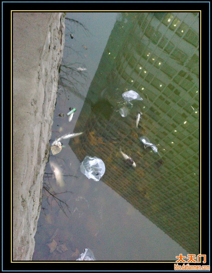今天早上晨练时,看到紧挨人民医院的东湖水面上,很多鱼翻白了,于是有很多人去抢这样的鱼。看看这水质,虽然比天门河下游的水质要好点,但人民医院排出的费水中有什么可想而知了,这样的鱼能吃吗?希望东湖的鱼只做观赏,不要出卖到市场上!
