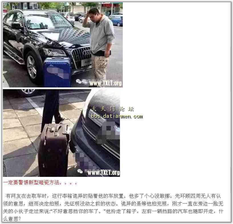 车友们一定要注意了,最近出现了一种最新碰瓷党车。凡遇到碰瓷党最好的解决方法是报警、拍照取证。