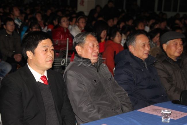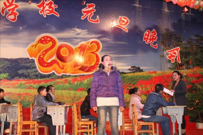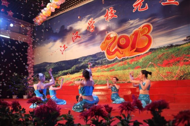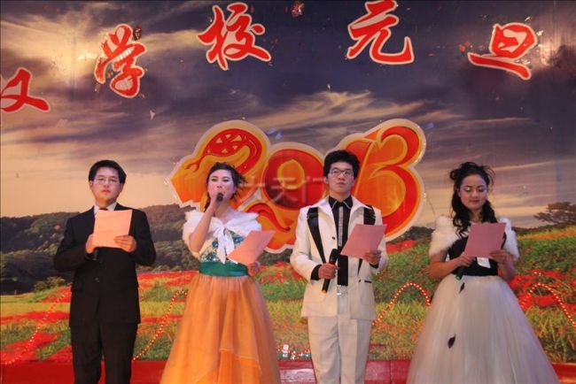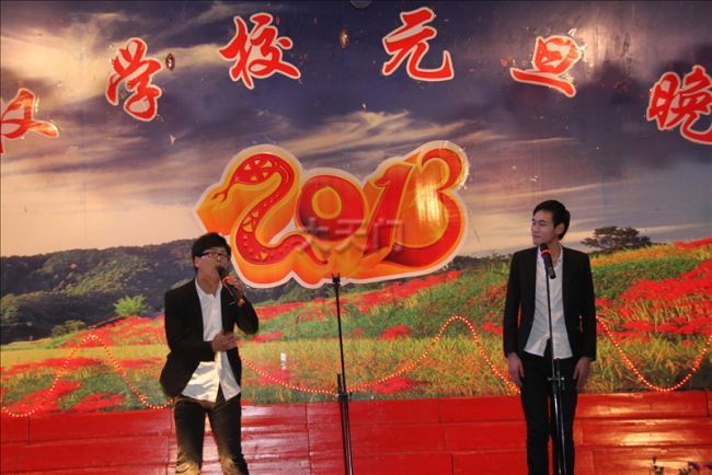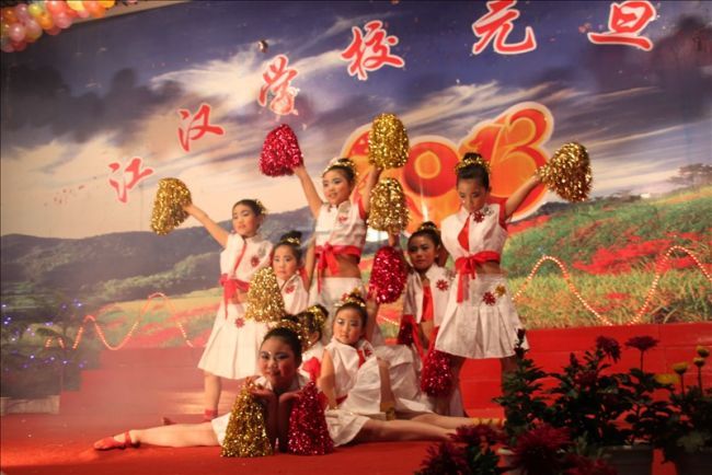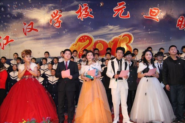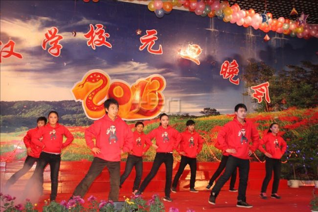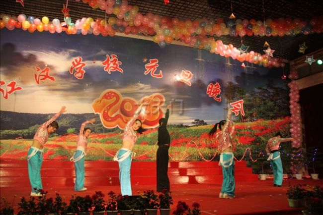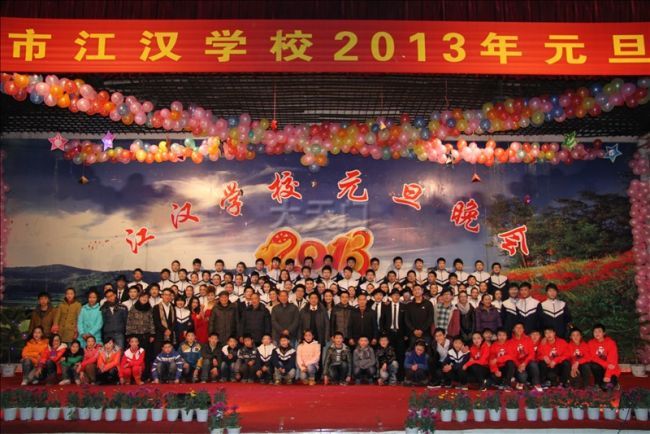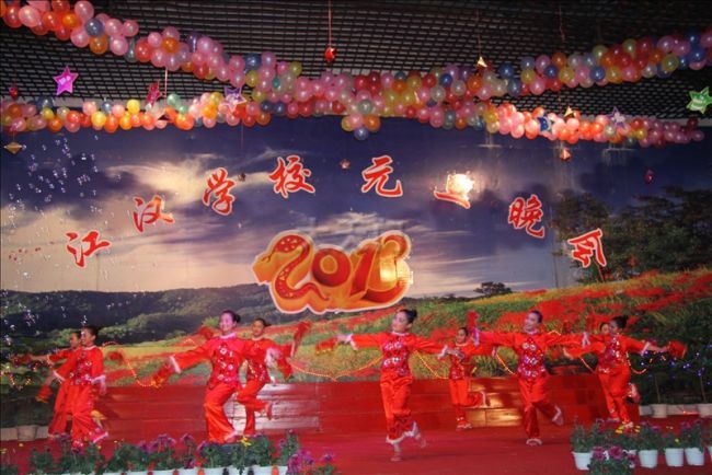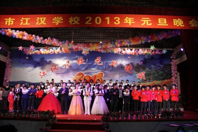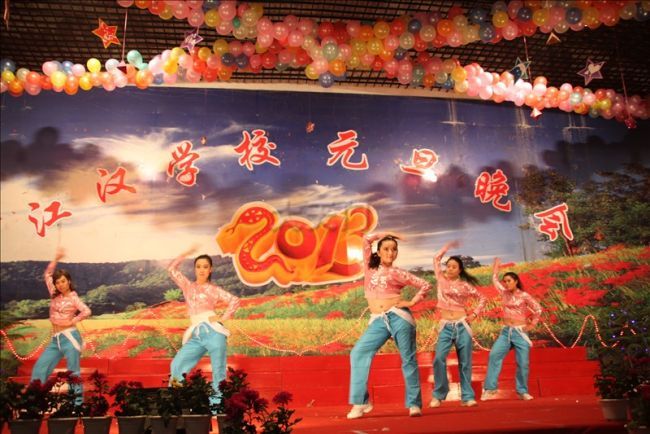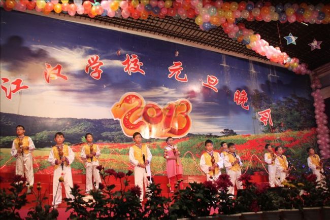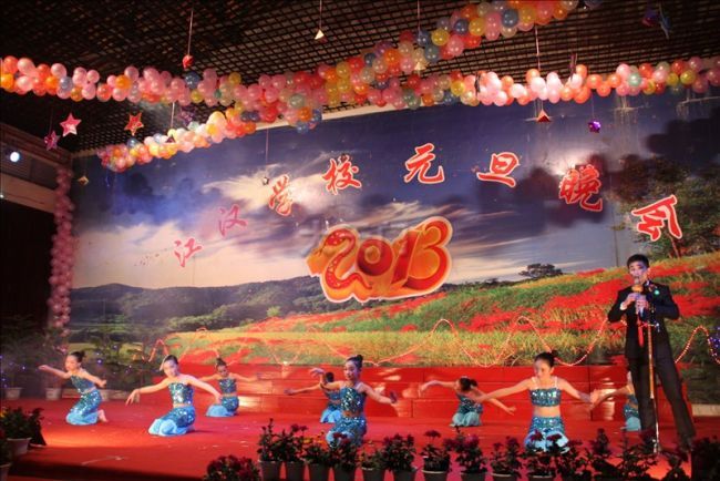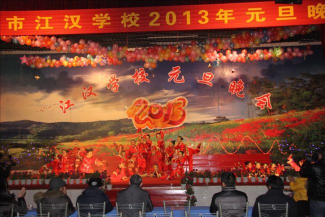 燕舞莺歌喜盈大地,桃欢李笑春满校园。12月31日晚7点,江汉学校2013年元旦晚会在校礼堂隆重举行,全校师生都沉浸在辞旧迎新的欢乐海洋中。 伴随着喜庆的《福娃闹春》的开场舞,元旦晚会正式拉开帷幕。老师和同学们载歌载舞,用曼妙的舞姿、嘹亮的歌喉抒发着喜悦的心情,迎接着新年的到来。高一学部的赵耀、童勇带来的歌曲《父亲》深情并茂,感动全场;英文歌合唱《If you are happy》、男声独唱《我相信》、大合唱《走向复兴》等歌声嘹亮,悦耳动听,健美操、激情现代舞《Circus》等舞蹈活力无限,动感十足;校团委学生会成员带来的舞蹈《江南style》青春洋溢,掀起了全场的高潮;唯美的古筝书画表演和葫芦丝演奏则把全校师生带入到优雅的古典氛围中。 最后,伴随着《难忘今宵》的音乐,本次元旦文艺汇演缓缓落下帷幕。整个汇演节目形式多样,精彩纷呈。歌曲、舞蹈、相声、朗诵、小品、器乐演奏等同台争艳,各领风骚,充分展示了江汉学校师生积极向上的精神风貌与和谐的校园文化景象。 晚会现场主持人杜雪等王校长致辞歌曲:父亲校领导出席晚会董事会领导出席晚会同学们观看