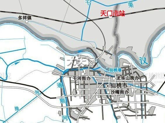 天门南站设于天门市多祥镇仙北,距仙桃城区约7km,距天门市中心约35km。 一般中间站,办理客货运作业 新建规模:设到发线6条,基本站台及中间站台各一座。货场规模按600kt设计,设尽头式货物线4条。站房面积4000平方米。