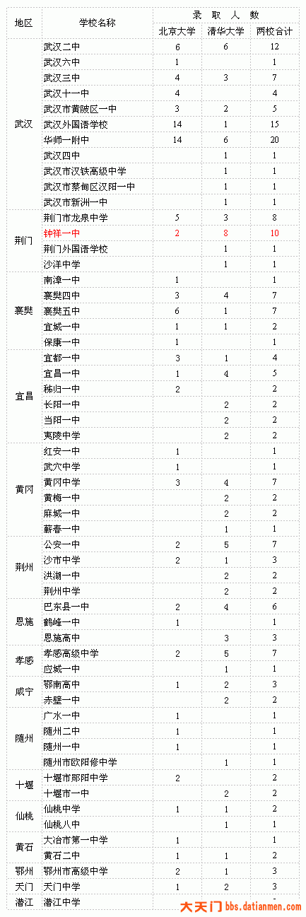 北大、清华2009年在鄂录取人数分布表