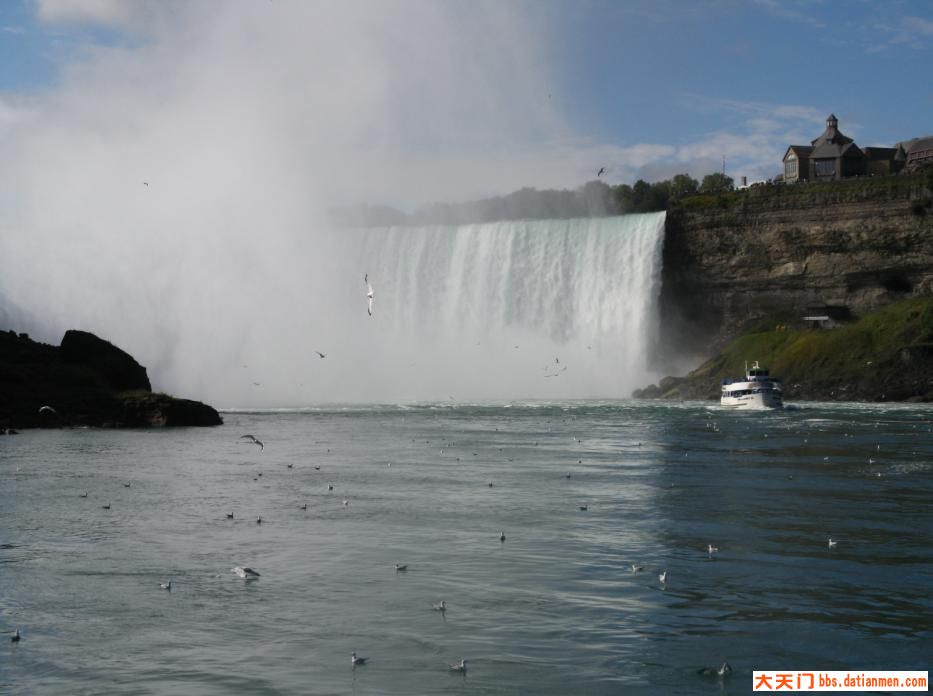 马蹄形瀑布远望回头看美国瀑布和新娘面纱瀑布近看马蹄形瀑布(加拿大瀑布)马蹄形瀑布是尼亚加拉大瀑布的三个组成瀑布的最大一个平视尼亚加拉大瀑布老爸站在观景台上瀑布下游联络美国和加拿大的彩虹桥,对面就是加拿大了