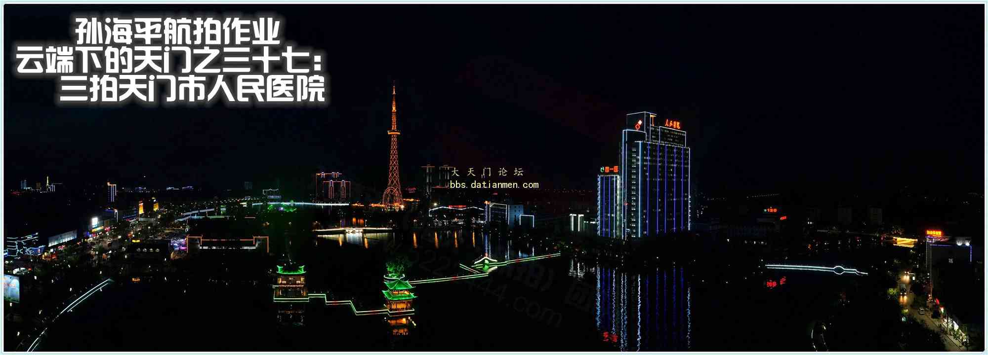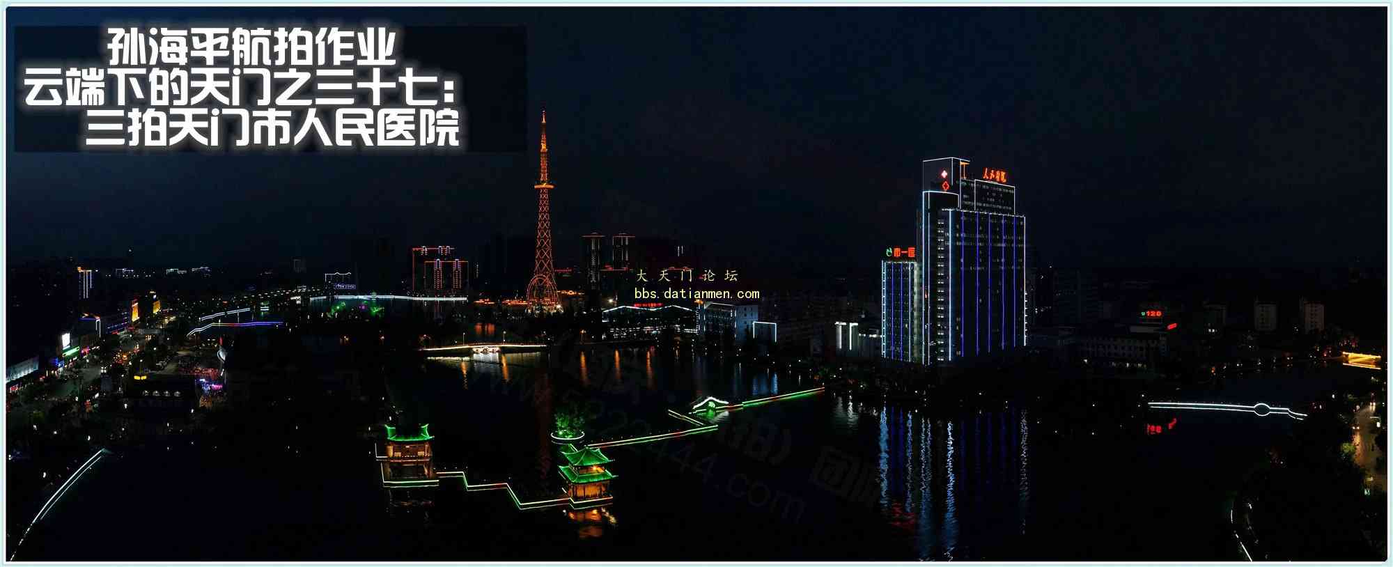 这几天航拍天门市人民医院,昨夜(2014年9月4日)的夜航因为夜游的爹爹婆婆围观、加上人民医院的灯光不太理想让老孙草草收场。今天下午和天门艺术摄影学会汪主席聊天,信口说起夜拍的灯光问题,我说能让人民医院将面向东湖的那面灯光开足,让东湖风景区的灯光能在6:30分开启,能让电视塔的灯光也在6:30分开启......那就好了~~~言者无心,听者有意,汪主席在17:14分在QQ上给我留言:东湖的灯光可以在6:30提前开启,人民医院的灯光也在6:30分开启......