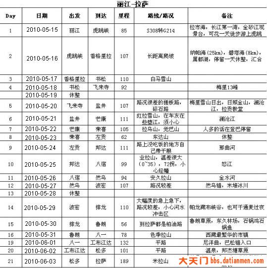 2010年滇藏线计划书如下表,出发日期在5月15日,不会有大的变动。