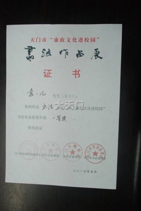 市教育局举办“天门廉政文化进校园——书法作品展”。这次书法作品展共收到600多份参展作品,最后评选出一等奖3名,二等奖5名,三等奖13名,优秀奖88名。我校学生袁一凡获得一等奖,李震获得三等奖,旷唯依、杨益获优秀奖。