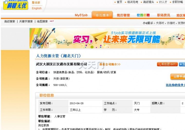 大润发准备开始招人了,世贸还不加快进度?发现大润发在51JOP和智联等招聘网站发布招聘人力资源主管的信息了!最近几天发布的,工作地点是天门。但是世贸进度还是这么慢啊,大润发签约了,进度赶不上也是要赔钱给人家的。
