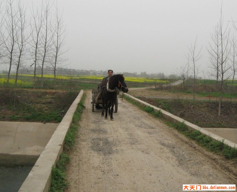 堂哥在前面等。等一会儿还不见人来,果然是胎暴了。只好在路边等,看村头的鸡们和狗们漫步。一只状如狐狸的黄狗,躬背撅尾在墙边用力大便。远处金黄的油菜花,路上行走的村人。约十多分钟,后面有队员上来了,胎补好了。