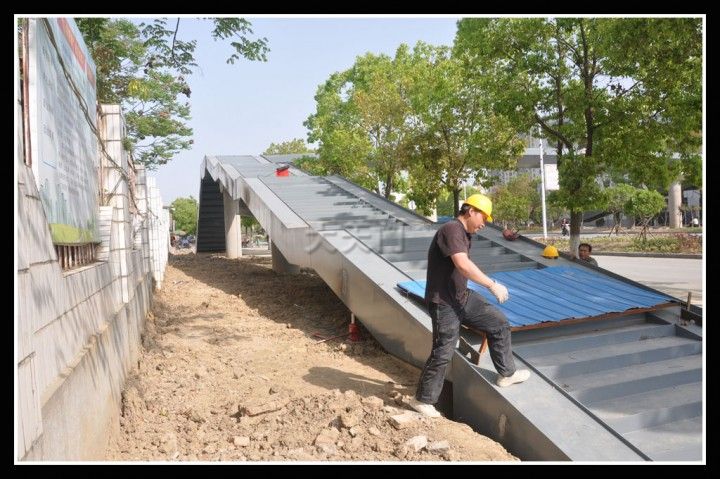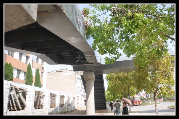 实验高中南院和北院之间隔着陆羽大道,由于陆羽大道上车流量比较大,学生跨越两院非常不安全。 今年年初,投资三百多万元的过街天桥开始施工。昨天我看到,一座全钢架的天桥已经横跨在陆羽大道上,高度为5米,不影响车辆通行,工人师傅在对天桥的引桥最后的检修。据施工人员介绍,本月底,天桥就可交付使用。