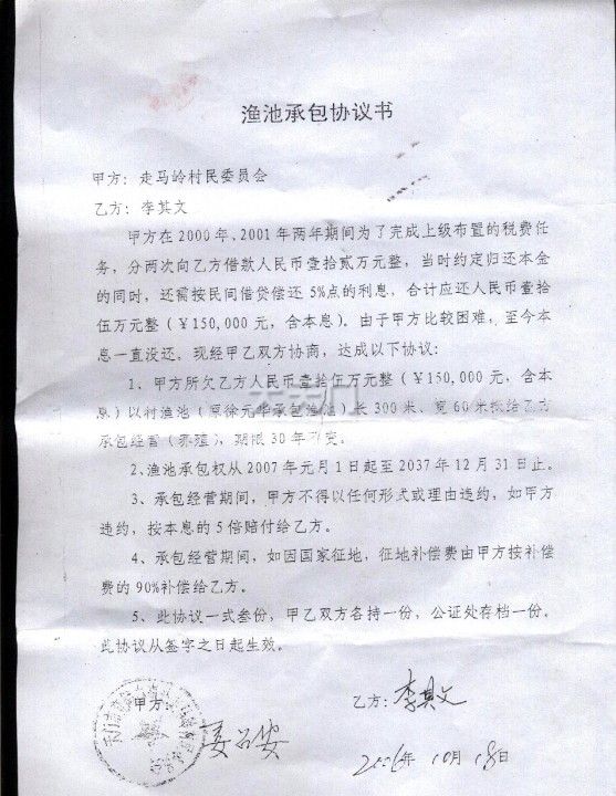 2007年与村主任签订了一份渔塘承包合同,当时已在公证处公证,而村主任让徐元华一直经营至今,使合同一直无法执行,让我家庭背负沉重债务,受到借款人对我的指责,引起社会与家庭的不和谐,老婆经常提出离婚,年迈的父母也因此忧心忡忡,不能安度晚年。