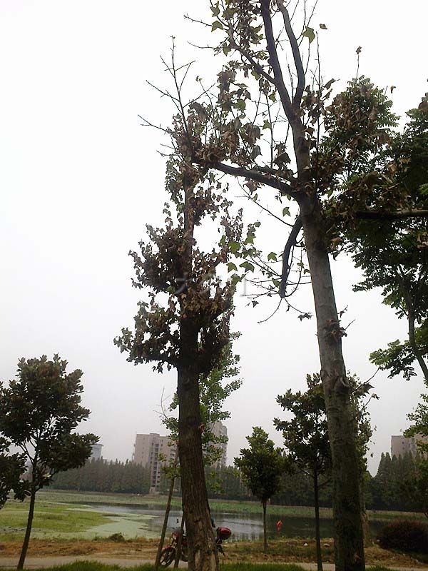 本应枝繁叶茂的季节,可位于西湖边的一块绿地里的十来棵法国梧桐树,确都过早的开始凋零。 只见绿地里所有的法桐叶子,无一幸免的开始莫名枯黄,有的树枝上的叶子都已掉完,和旁边正常的树木形成鲜明对比。 不晓得这种法桐叶子异常枯黄掉落,是天灾?还是人祸?希望相关部门多关注下。