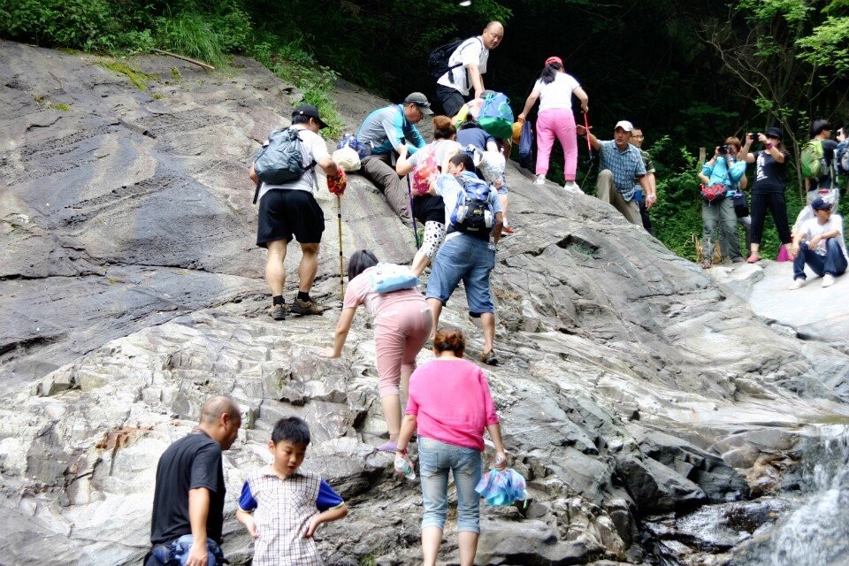 下山一路轻快,路很原始,有的在荆棘丛中,有的只是在石壁上凿的小坑。路在溪流的两边来回穿梭,过溪流要么跳越,要么赤脚淌水。调皮的谦哥也撩发了少年狂,不走寻常路,像猴子一样冲上了悬崖壁,引来了阵阵欢呼声。
