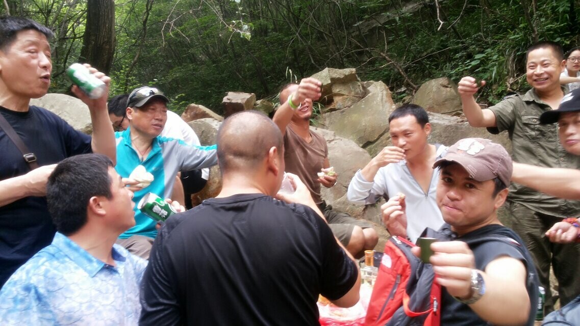 谷底的风景美不胜收,大家都很开心,中午自备路餐充饥,大家把干粮集在一起,聚了一个大餐,面包,鸡腿,卤菜,花生,果冻,粽子,发鱼,火腿肠,白酒,啤酒,饮料......应有尽有,享尽舌尖上的美食。看吧,喝酒也不忘来一句:1,2,3,喝!