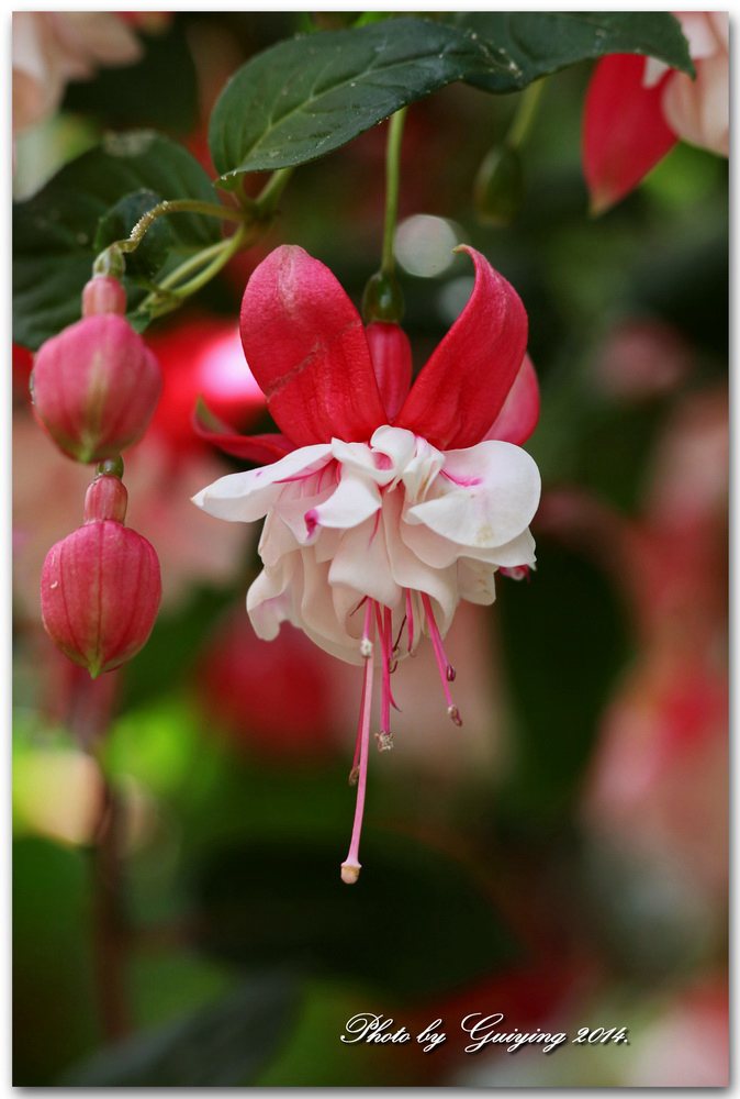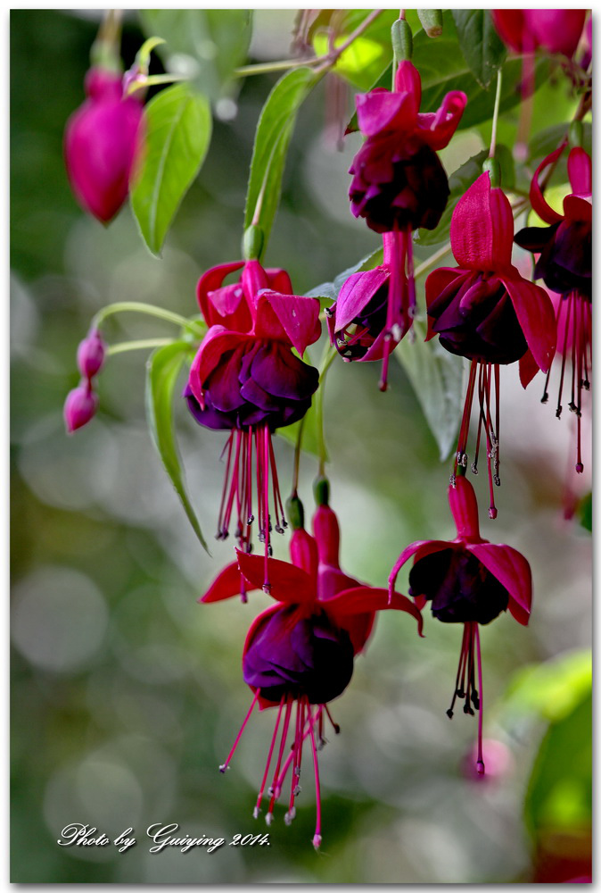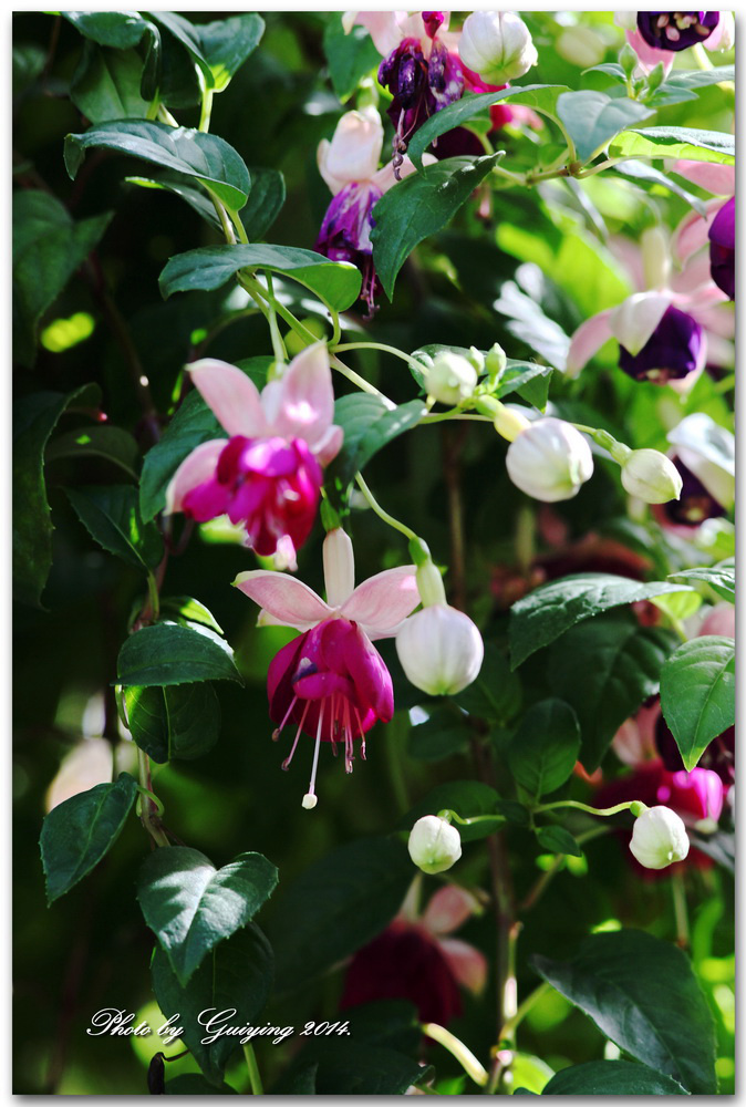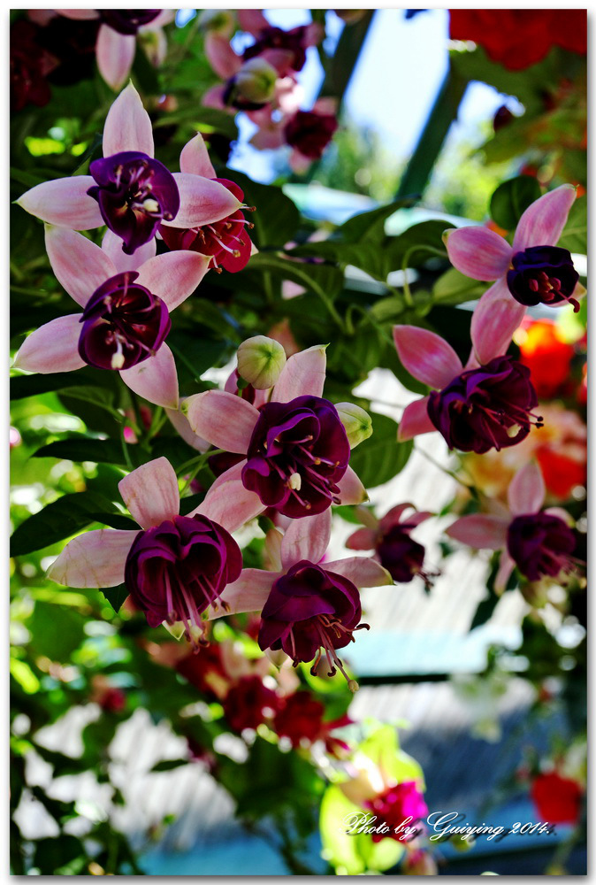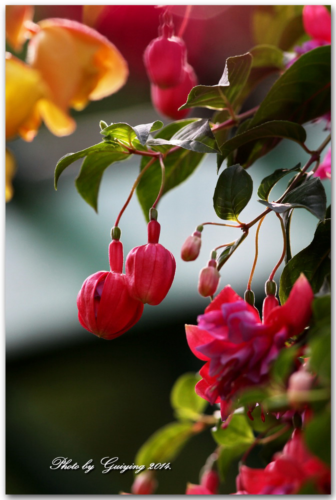 倒挂金钟(拉丁学名:Fuchsia hybrida Hort. ex Sieb. et Voss),别名灯笼花、 灯笼海棠、金铃花、吊钟海棠、吊钟花,为多年生草本花卉,它的种类繁多,主要花色有红、紫、白三个品种。