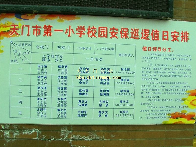 阳春三月,花红柳绿。天门市第一小学为了创造一个安全、有序的上下学环境,通过爱心家长们自愿报名,率先成立了“家长义工安全护学岗”小分队。 每天早晨7:30至8:10分及下午15:40至16:10分,该校各年级当班的家长志愿者们都提前到岗了。他们手臂上佩戴红色标章,分别在学校东校门口与北校门口的马路两边及周边学生上下学主要路段,协助值勤教师、交通jc、学校保安共同维持秩序,疏导校门口的人流和车流,为孩子们铸就了一道安全的屏障。 该校目前在校生有60个班近3000多名学生,每天上下学时段都有许多家长接送,此时的人流量、车流量非常大,交通状况一度拥挤不堪。自今年新学期开始,该校充分发挥家长委员会的作用,积极动员广大学生家长参与志愿者护学岗工作,使得学校放学时段的交通秩序、治安情况大有改观,得到家长和师生的一致好评。因此,本学期在家校协会的倡导下,有更多的家长都自愿加入到这个保卫队伍中来。为了孩子的安全,家校联手,全力以赴。 通过“家长义工安全护学岗”行动,不仅给孩子铺就了一条安全、有序的放学之路,还开创了“家长管理家长,家长督促家长,家长引领家长”的新局面,使家校合作越上了一个新台阶。高丙元校长:温馨提示 良好的交通秩序需要每一个社会公众共同来创造,“护学岗”再多,也需要每位家长朋友们和市民朋友们文明意识的提高和积极配合,希望家长们继续保持,自觉遵守交通法规和学校要求,共同维护良好的交通秩序,为我们的孩子撑起一片安全晴朗的天空。 相信如此的家校合作,营造的是温馨、和睦的家校氛围,缔造的必将是安全有力、坚实奋进的一小教育品牌!值日领导心语:张艳丽:爱心家长护学岗,共筑安全上学路 “爱心护学岗”得到了家长的响应,不仅有全职爷爷.奶奶们都积极参与到这一活动中来,连创业一族的爸爸妈妈们也挤出时间来站一岗或是半岗,再忙,也要为孩子站一班岗!愿为孩子们多尽一份力。老师心语: (1)四(1)班汪汉荣:学校是孩子成长的乐园,知识的蜜园,孩子是祖国的花朵,祖国的未来。为孩子创造一个安全、温馨的环境是每一位老师,每一位家长的职责。 (2)六(1)班赵翠英:家长护学岗得到了广大学生家长的支持。家长们踊跃报名,并纷纷表示,有了家长参与的护学岗,可以更了解学校的安全工作,拉近了家校距离,同时提高家长和孩子的安全意识和自我保护意识。家长心语: (1)一(1)班徐新民家长:看到自己的孩子在“护学岗”成员的带领下安全地通过马路,我心里变得踏实,更多的是感激。 (2)六(2)班陈燕家长:现在学校门口有家长、教师、保安多方合力共同护学,无论刮风下雨,他们都会在这里值岗,为每一位上学的孩子保驾护航。有了他们,我的心里踏实多了,不会担心孩子们在过马路时被来往的车辆撞倒,他们是我们孩子的保护神,衷心感谢每一位护学者,我们也将尽力配合学校的工作!