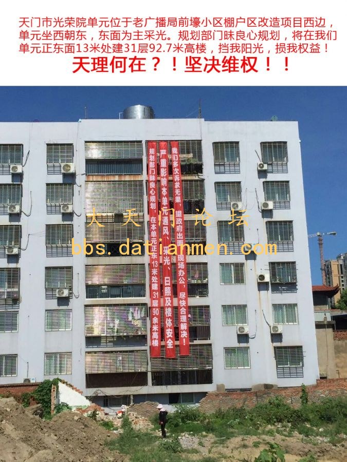 天门市光荣院单元位于老广播局前壕小区棚户区改造项目西边,单元坐西朝东,东面为主采光。规划部门昧良心规划,将在我们单元正东面13米处建31层92.7米高楼,由于楼层高、间距小,该楼建成后将会严重影响我们单元住户的通风、采光、日照以及楼体安全。我们多次诉求无果,望政府出面,充分考虑我们的房屋主采光面在东面这一实际情况,现场办公,拿出一个解决方案,给我们一个合理的答复!