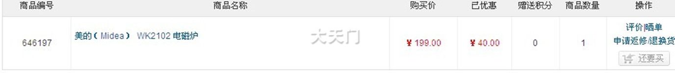 前几天家里电磁炉坏了,拿去修理,别人说是电路板坏了,要80元,我想了想不值得,就到镇上卖家电的去转了转,我看美的多少钱,营业员给我介绍别的牌子,且让我看的都是4 5百元的,说到时优惠点说别人买的美的5百多的都没用几天,其实我比较喜欢美的的。回家上网看了一下,一款美的199元还送2个锅,电磁炉嘛能烧就行了,只要是正规厂的,我消费只讲实惠。电器嘛只能上京东 国美 苏宁放心点,但是担心不能送到镇上来,百度了一下,有镇上的朋友买过,京东网购比较成熟就选了京东。晚上下单,第三天下午货到家,走邮政ESM,免运费。非常满意,关键是放心不会买到假货,且价格不会让别人忽悠,又有正规税务发票,消费了也交税了为国家作了贡献吧。我们在镇上选择非常的少,有了京东 国美 苏宁,我们就有了另一种选择。