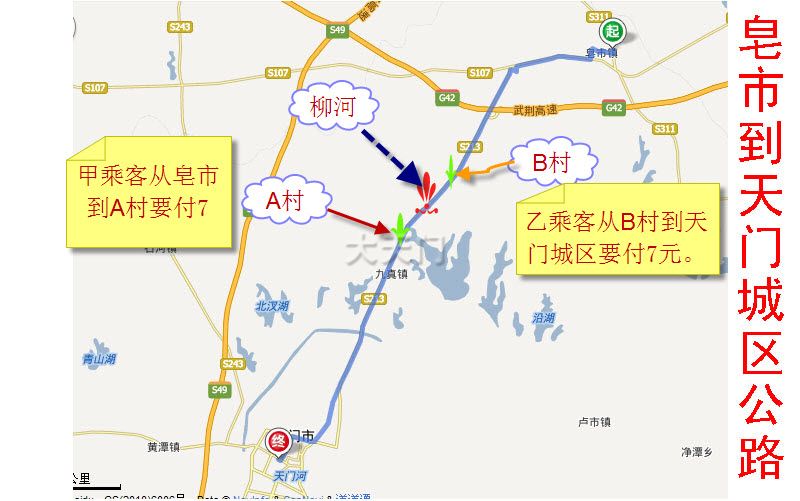 昨天去皂市一个同学家做客,乘车回来时遇到这样一幕:在皂市上车时甲旅客问售票员,到A村(如图,后来才知道比柳河稍远的一个村,我忘记了村名,不妨就叫A村吧)多少钱?售票员回答说7元,甲乘客说这样贵呀?售票员说一老都是这样啊。离柳河不远处的B村(还没到柳河),有乘客招手上车,上车后,同样的问答,也交了7元钱。我当时就想,甲乘客也只过了柳河一点远啊,怎么就要交7元呢?因为从皂市到天门城区全程也就只有8元啊,后来下车后问别人,他们说这是线路车的潜规则啊。