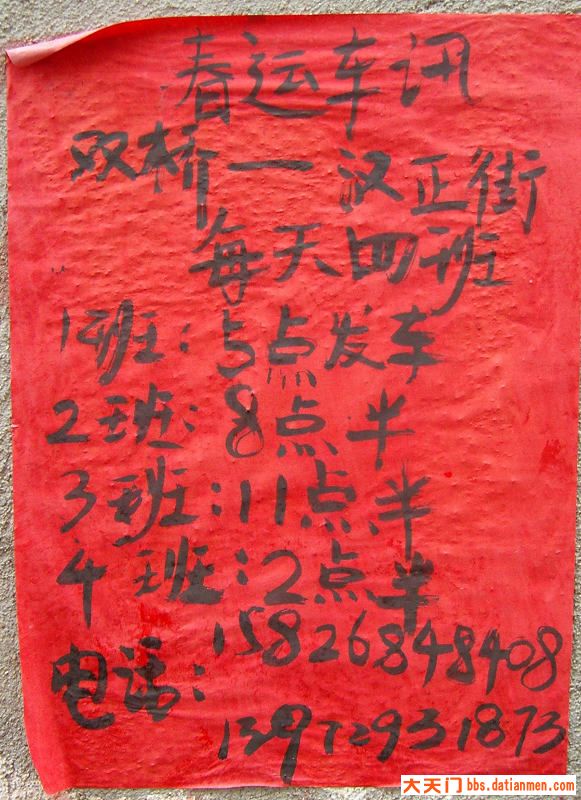 为了方便大家出门,可以在这里留下天门到全国各地的随车电话号码以及怎样坐车方便到家,不会传的联系我 QQ:39613838