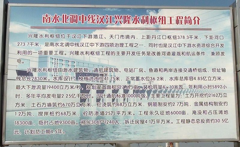 1、兴隆水利枢纽(兴隆大坝)位于汉江中下游河段湖北省潜江、天门市境内,上距丹江口水利枢纽378.3公里,下距河口273.7公里,是南水北调中线汉江中下游四项治理工程之一,同时也是汉江中下游水资源综合开发利用的一项重要工程。工程由拦河水闸、船闸、电站厂房、鱼道、两岸滩地过流段及其上空的连接交通桥等建筑物组成,开发任务以灌溉、航运为主,兼顾发电。自2009年2月26日开工至12月26日下午3时58分,兴隆水利枢纽仅用10个月就已完成了移民安置、导流明渠、围堰防渗墙、左岸交通桥等工程,并实现了当年开工、当年截流。工程总工期约4.5年。2013年完工后,天门可以开发为汉江左岸旅游观光景区,这比出远门游山峡大坝更实惠、更安全。家门口的大工程,大景观,天门人身边的大坝,想看山峡大坝,先到这儿来,一样的感觉,同样的享受。