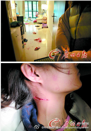 在广州,独居的王小姐听到门铃响,门外男子说是送快递的,还拿着包裹。王小姐常网购,便下意识开了门,不料对方掏出30厘米长的水果刀要打劫,王小姐拼死搏斗,将歹徒打跑,她则身负刀伤,颈部动脉差点被划破!
