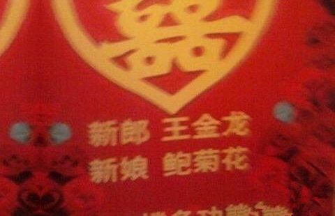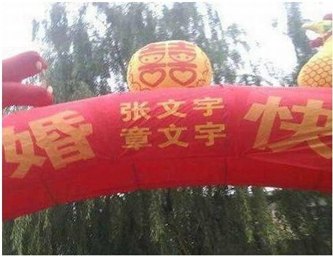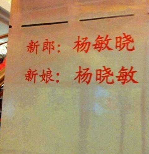 ▼新郎叫彭飞,新娘叫彭飞飞,那么今后孩子起什么?▼新郎孙大萌,新娘孙小萌,这是兄妹?▼新郎张文宇,新娘章文宇,同名同音姓。以后吵架怎么劝啊?!▼新娘你是来搞笑的么.....▼新娘名字亮了.....▼新郎杨敏晓,新娘杨晓敏。主持人正在恶补绕口令......▼新娘名字雷死我了,雷死我了!▼这两口子一定是道上混的~~~▼新娘的名字又闪到了我的双眼!▼新郎王刚,新娘和申。你们这是穿越了吗?▼新郎李振华,新娘李挣扎。主持人正在练习绕口令......▼曾整容?我累个去!▼新郎新娘同名同姓!太巧了,赞一个,要幸福哦!