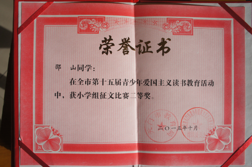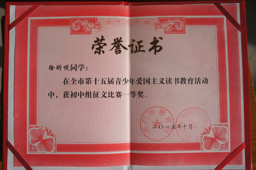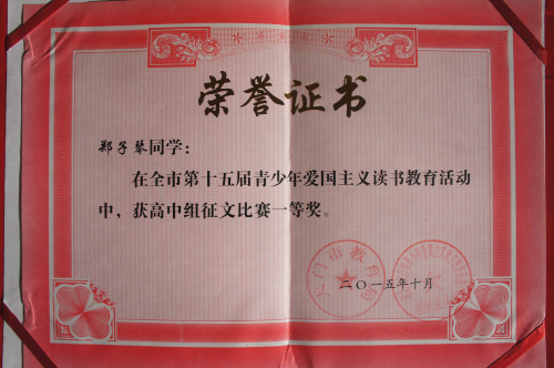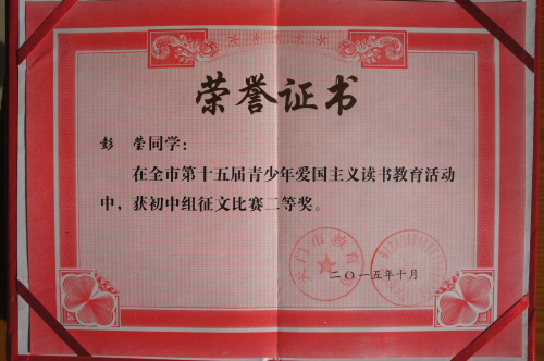 根据市委宣传部、市教育局、团市委、市物价局、市文广新局《关于开展天门市第十五届青少年爱国主义读书教育活动的通知》(天宣文〔2015〕3号)文件精神,市教育局在全市中小学生中开展了以“自强不息、厚德载物”为主题的爱国主义读书教育活动,组织了“我身边的传统文化”征文比赛。经市组委会评审,有90篇征文获奖,我校共有6名学生征文入选,现按组别对获奖学生予以通报表彰。 附:征文获奖名单 小学组:二等奖 六⑵班邵山《悠悠茶香》 初中组:一等奖 七⑸班徐昕悦《爱不完花鼓戏》 二等奖 七⑴班彭莹《又是棕香时》 高中组:一等奖 二⑶班郑子琴《品味国学经典,铸就高雅人生》 二等奖 二⑽班黄淑敏《心有千千结》 三等奖 二⑵班秦子涵《我和书法的故事》 江汉学校