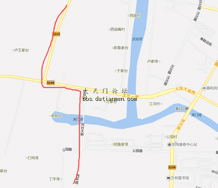 自此 天门大外环可以说是完成形成。以大润发为中心的大外环辐射整个天门。希望天门的交通网更加的完善,方便的市民出行,提升自身的实力,促进经济的发展。 除了大交通外,在地图上还看到一些没有完成的道路比如在涂台这里本来有一条道路与义务路相连,百度上看不到,谷歌上看到两边都修好了 就是中间没有修好 ,放大了看之后是有几户房子还没有拆。。。。