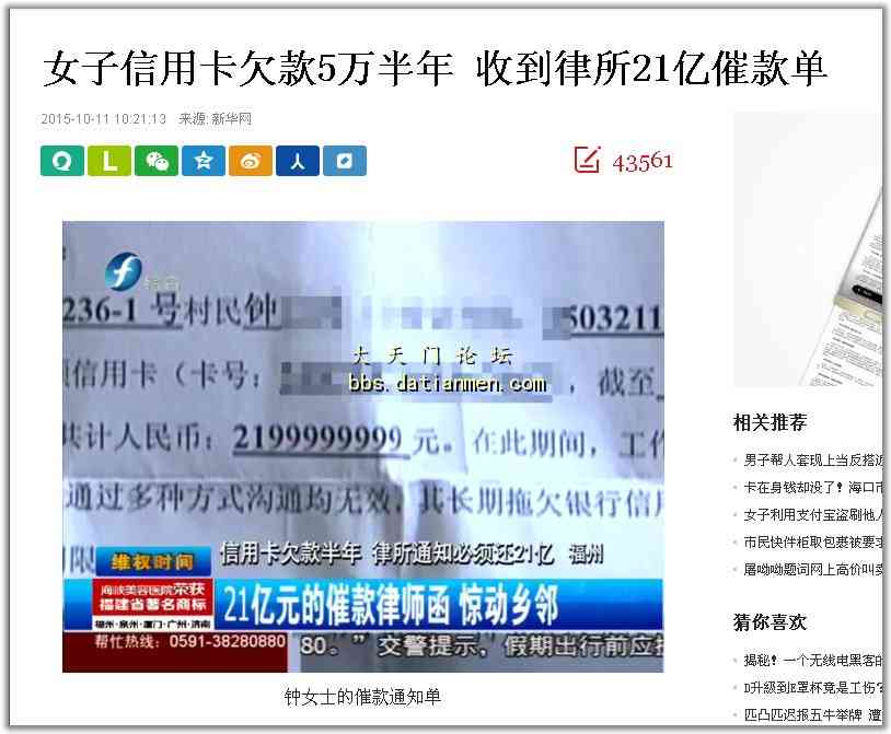 女子信用卡欠款5万半年 收到律所21亿催款单