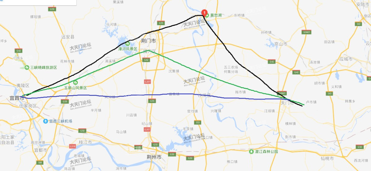 2、天门——荆门——当阳——宜昌。明显天门到沙洋再到宜昌一条直线,非得绕过沙洋走荆门,线路像心电图,舍近求远。从全国的大角度出发,走沙洋才是符合大多数人的利益,如果真走了荆门。我只能说荆门人太牛X了,硬把线路拉弯了。