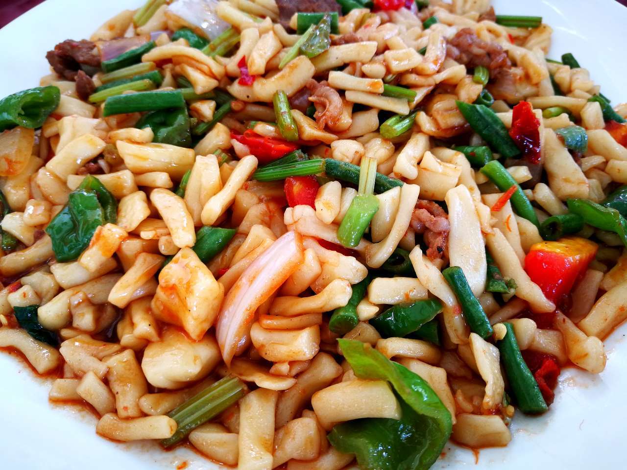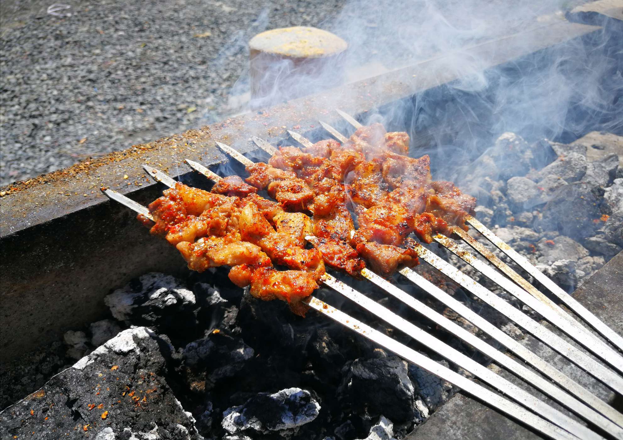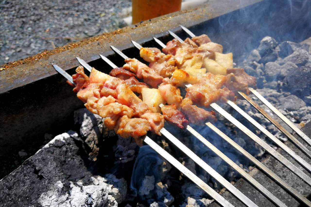 一路风雨兼程,走累了,在奎屯的路边停下来,农家乐的水果色香味俱全,杏子黄得晶莹剔透,李子红得全身是粉。后院小屋堆放杂乱,却满是淳淳的乡味,这种味道让你似曾相识而倍感亲切,这种味道让你立刻放松而卸下心历,就像你疲惫地回到家,把鞋子踢到角落,把衣服扔到椅背,把包肆意滑落地坂,然后闭上眼陷入沙发,一身轻松。你看,凉干的青椒,东倒西歪的土豆、西红柿和大葱…,是不是有一种回家释放后的慵懒感。最动人的是羊肉串,一串瘦一串肥,先小火烤出羊油,滴在火热的木炭上,顿时,肉香随着一缕缕青烟飘满小屋,撒一层盐巴入味,再撒一层辣椒粉增鲜,最后是孜然添香,顺序不能颠倒,每撒一次佐料,香味就更加浓郁迷人。和着羊肉的香氛,点了一盘丁丁面,一顿路餐就这样美丽地开始了!!!