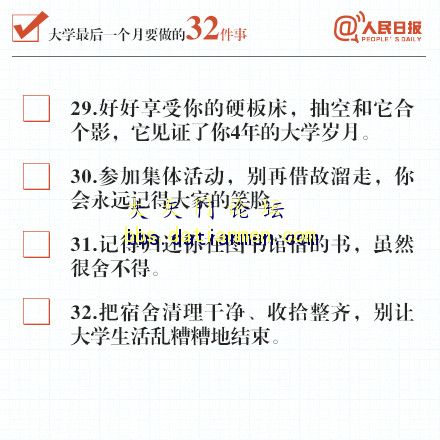 四年时光匆匆而过,转眼到了说再见的时候。大学最后一个月,必须要做的32事,你做了几件?转发,收藏,给自己列个清单,别让青春留下遗憾!