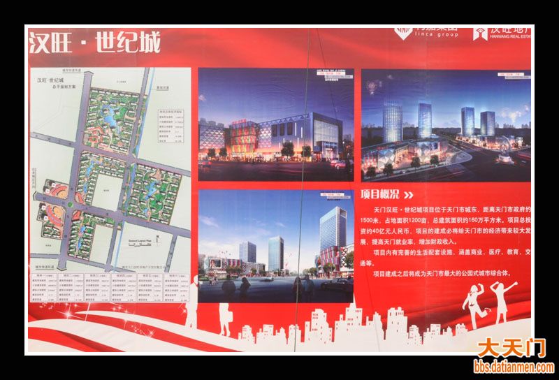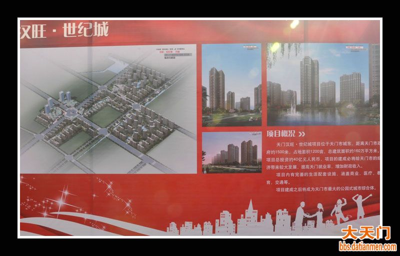 由汉旺集团承建的天门汉旺世纪城项目位于天门市城东,距离天门市政府1500米,占地面积1200亩,总建筑面积约160万平方米,项目总投资约40亿元人民币,项目的建成必将给天门市 的经济带来较大发展,提高天门就业率,增财政收入。