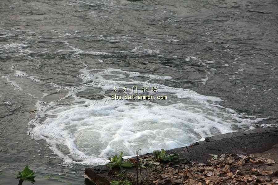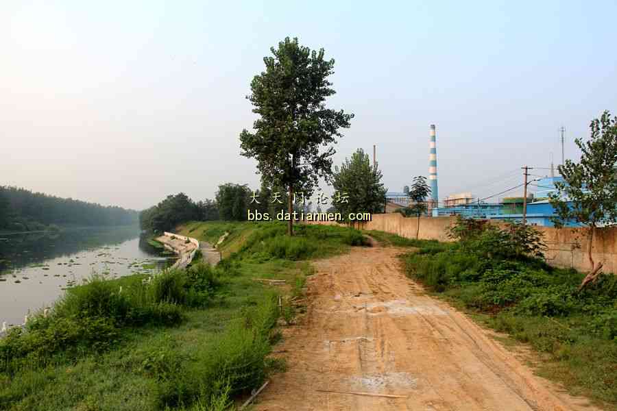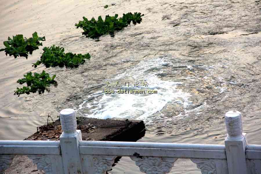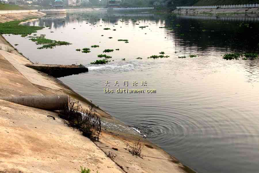 因为后门钥匙在工作人员手中,没有打开后门去看排放口。告别老总后,沿着工厂南边的小路,踏着荆棘野草,绕到天门河岸,找到排放口。肉眼直观,处理还是不错的。