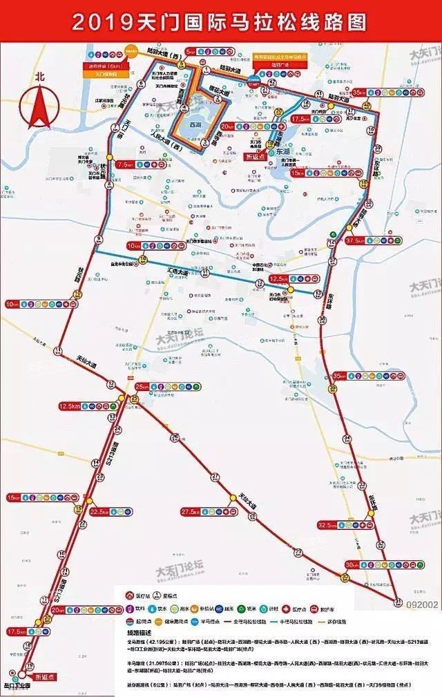 2019年天门国际马拉松将于11月16日举行,为确保赛事安全、有序进行,届时上午6:00起将对赛道(含天门至岳囗工业园赛段)实施全封闭交通管制,然后根据赛事进展实施滚动解封。 建议参赛人员合理选择出行时间,或乘车从随岳高速天门出口下。天门市公安局2019年10月29日附:2019年天门国际马拉松线路图