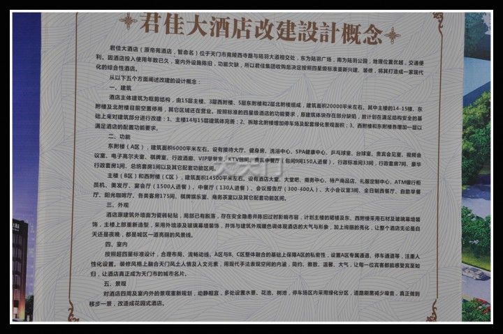 帝苑酒店建成于上世纪八十年代,原名“银都大夏”,二十多年来,一直是天门最大的酒店,外加特殊的地理位置,她承担了很多天门重大对外接待任务,但因使用年数已久,室内外设施陈旧,近来被君佳集团购买,按四星级标准重新兴建、装修,将其打造成一家现代化的综合性酒店,暂命名为君佳大酒店。