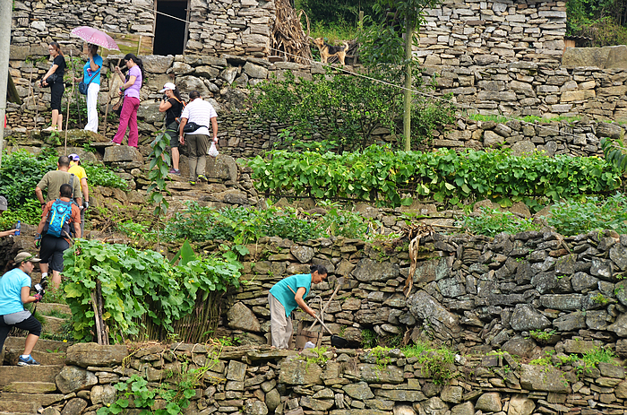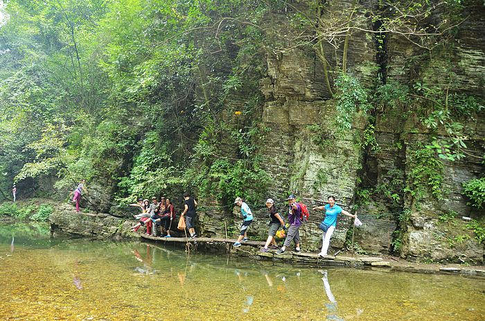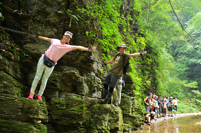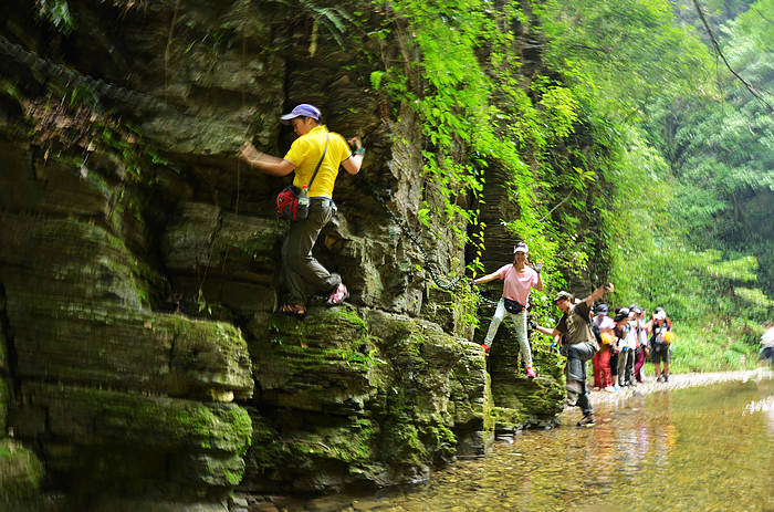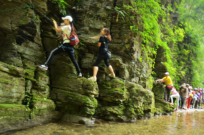 峡谷险峻,似乎没有可行的路,拉着铁链穿行更刺激啊。