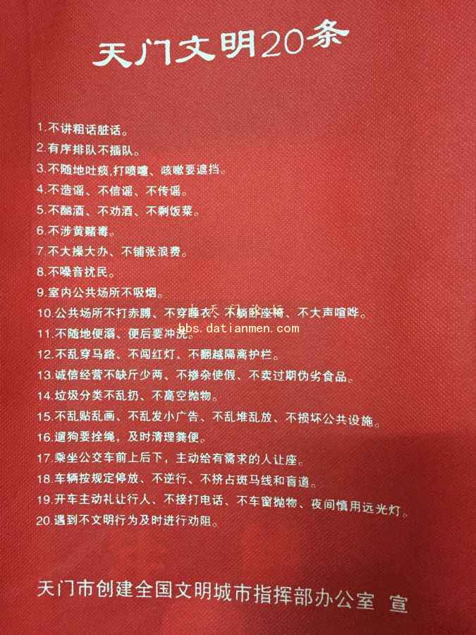 8月2日晚,市文明办在陆羽广场举行了《天门文明20条》发布会。具体内容如下图: