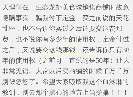 我也跟你一样,我前几天也被生态龙虾美食城的销售员给忽悠了,确实不应该相信他们那张嘴。买之前说的天花乱坠,也不告诉你买过之后还要交这费那费,也不说你有多少年的使用权,定金付过之后,又说要交这钱那费钱,还告诉你只有38年的使用权(之前可一直说的是50年)让人非常无语。大家以后买商铺的时候千万千万别被忽悠了。