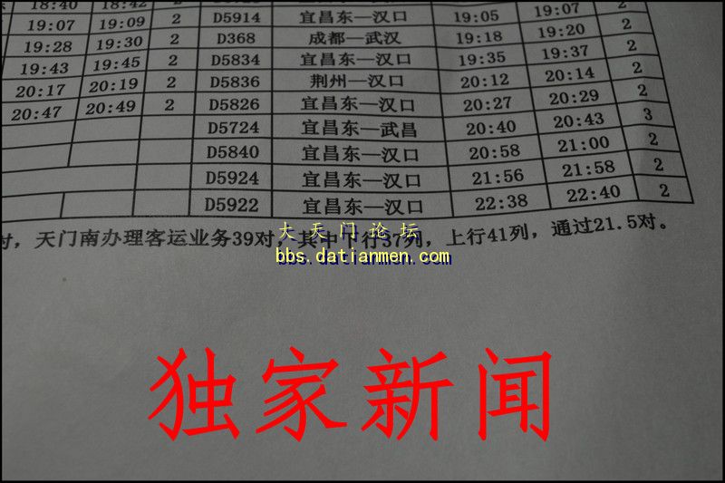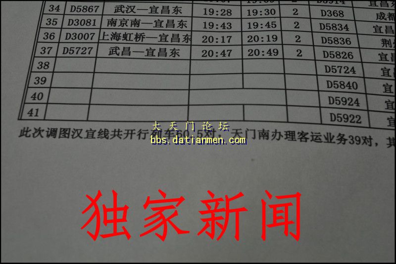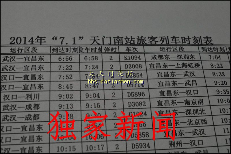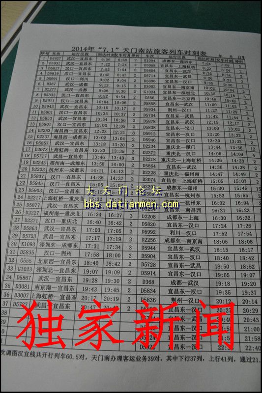 版主刚刚从天门市铁路办获悉, 在天门市委市政府的积极争取下,在国家铁路总公司和武汉铁路局的大力支持下,从7月1日起,天门南开通深圳北的高铁动车,天门南办理客运39对,其中上行37列,下行41列,通过21.5对!另附71调图最新消息: