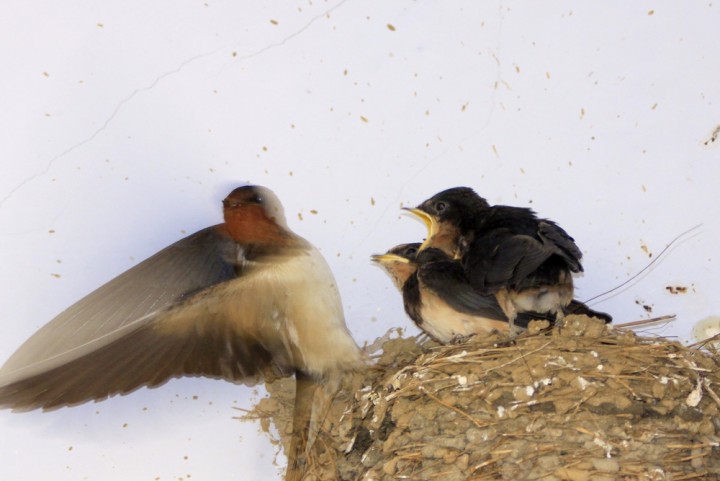 不知道过了多长时间,有一天我回家,抬头望见燕子窝里面多出了两个小脑袋,两个小家伙张着金黄色的小嘴‘喳喳’的叫着。我意识到,燕子的宝宝已经孵化出来了。这时公燕子从外面飞回来,径直落在窝的旁边,并且警惕的看着我。这时小燕子叫得更欢,燕子爸爸把嘴里面的昆虫喂进小燕子的口中,我连忙进屋把门关上。我想,还是让它们一家人尽情的享受一下这幸福、安静的生活吧。