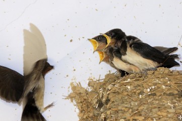 安家后约一个月,四五只雏燕,头比身子大,拼命地张着那镶着黄边的大嘴,比头还要大,等着燕妈妈叼着昆虫来喂食。约三周后就可以试飞了,跟着妈妈练飞翔,学觅食,为单飞作准备。“一身乌黑光亮的羽毛,一对俊俏轻快的翅膀,加上剪刀似的尾巴。
