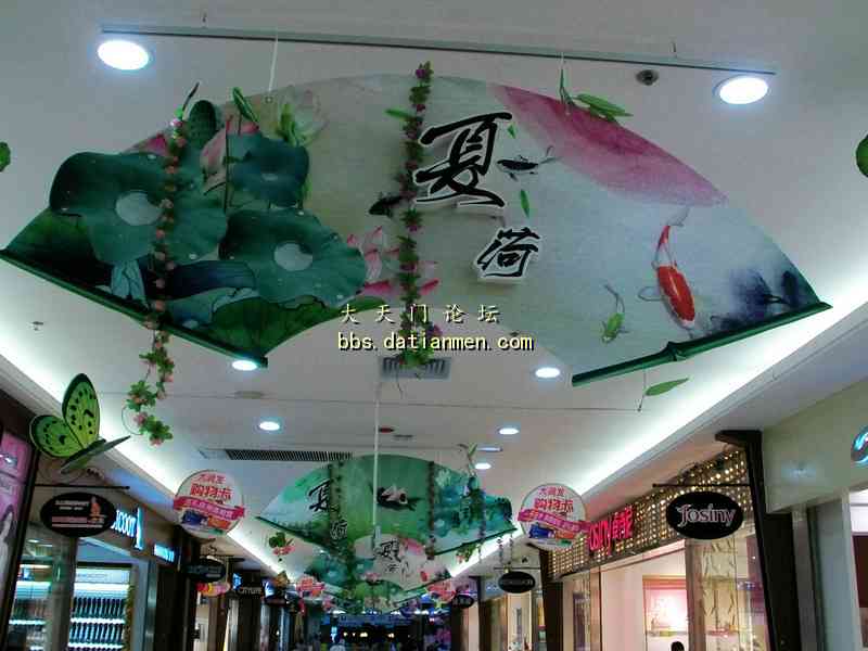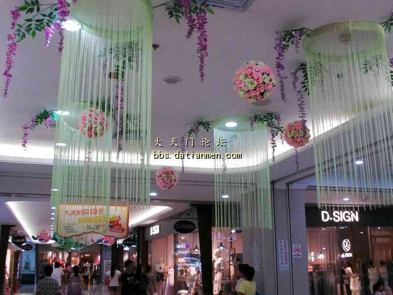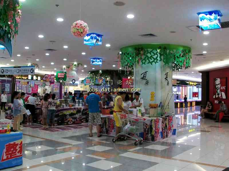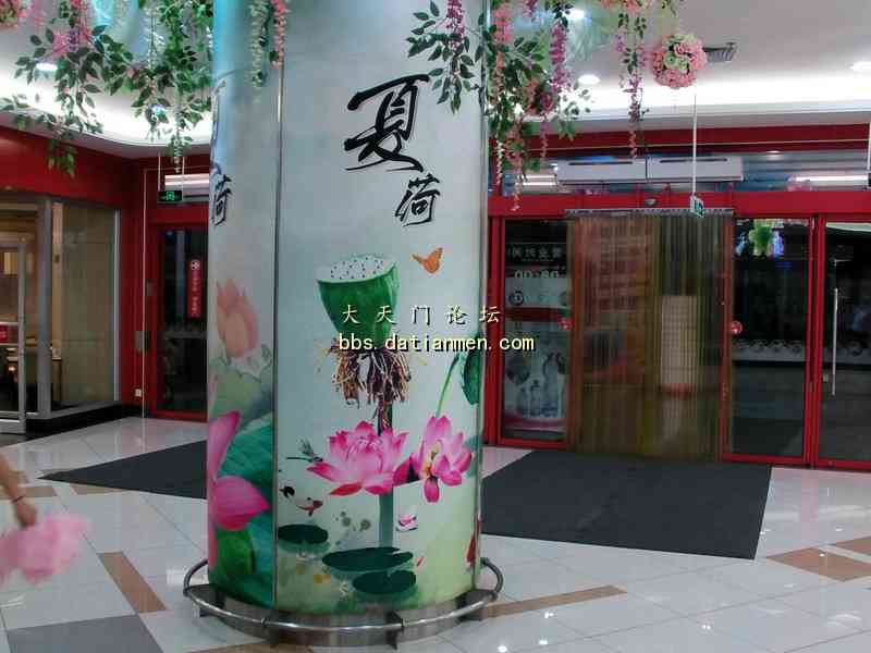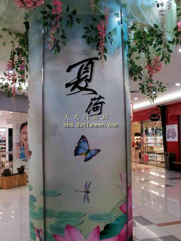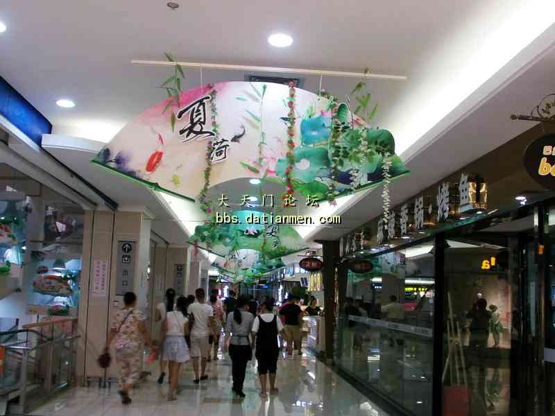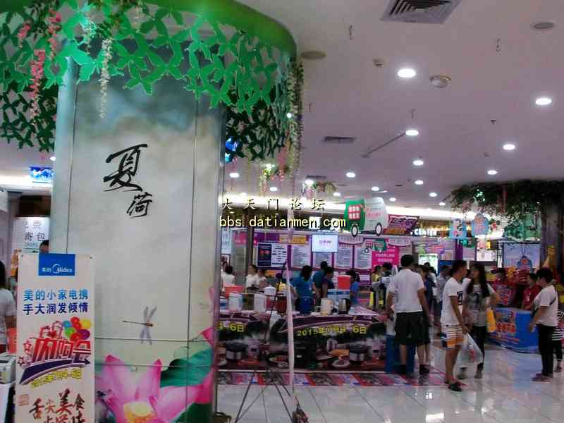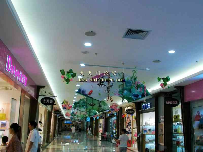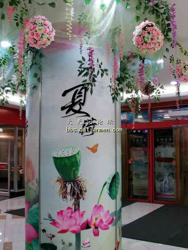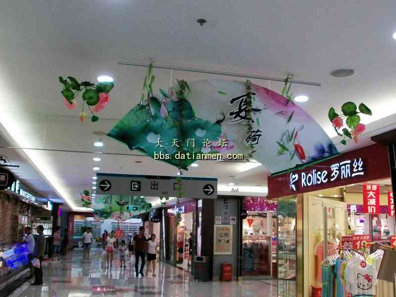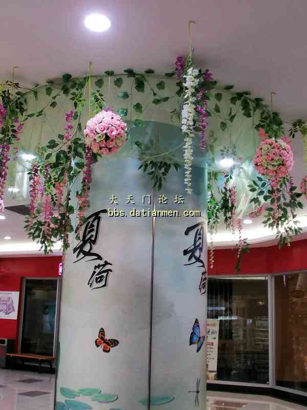 酷暑炎夏走进大润发___感受到凉爽.洁净.花香.人旺! 7月4日20时吃完晚饭手拿雨伞来到久违的大润发准备购买一些生活用品, 当步入大润店时的第一感觉是一阵凉风扑面, 并闻视到了扑鼻的荷花香的多种绿色花草植物;特别是那靓丽整洁一尘不染的店内与人行道。还有那三五成群的购物人流,他们手提肩背及推车前行的顾客们, 貌似来到了花园式的商店! 直接上图: