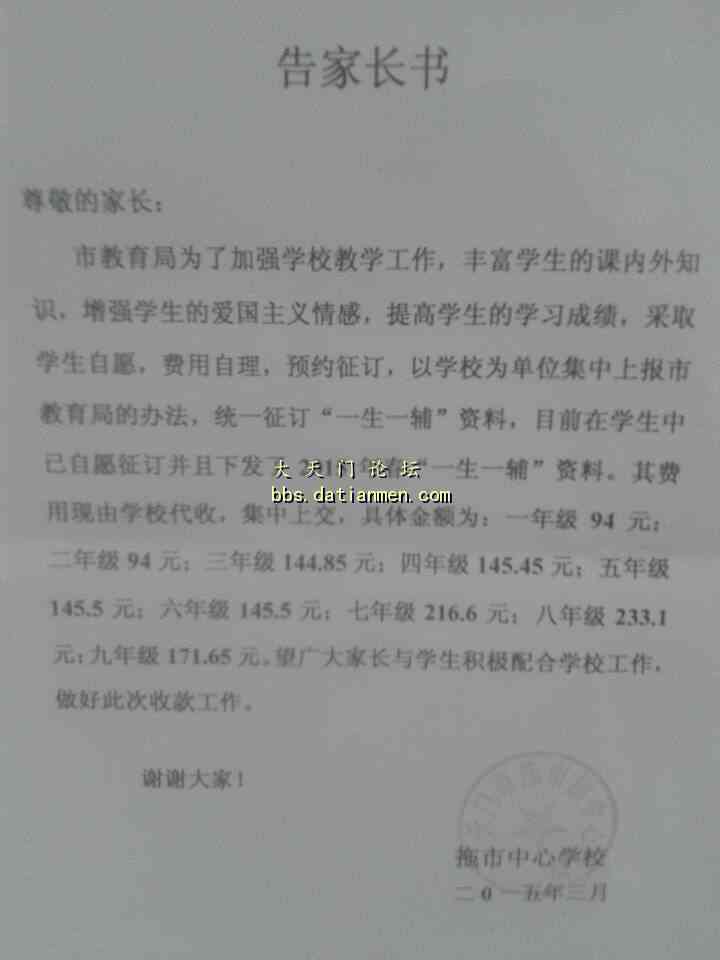 拖市镇全部的学校没有收费文件、没有家长意见书向学生收取一百多元的资料费,并且学生实际得到的资料的标价只有二十多块钱,有的年级甚至只有十多块钱,与收费标准严重不符!请有关部门来查一下,给拖市镇的学生家长一个交待!!
