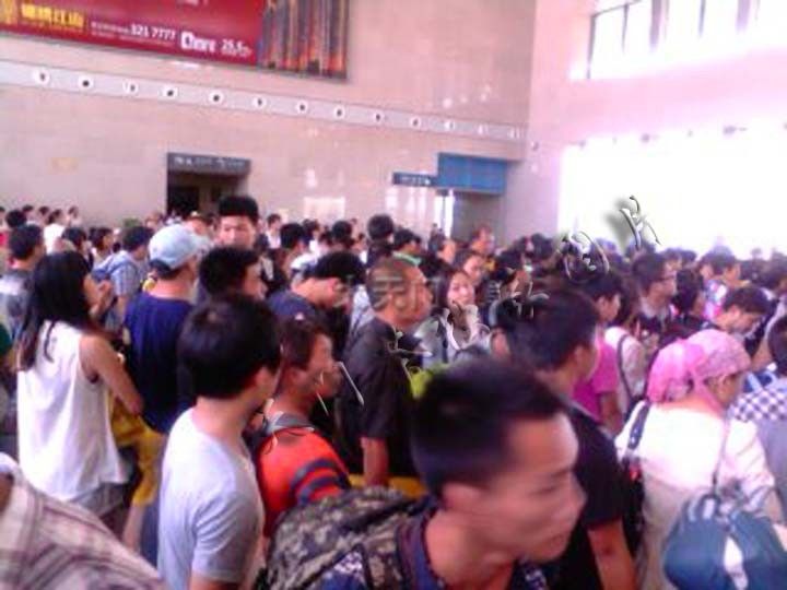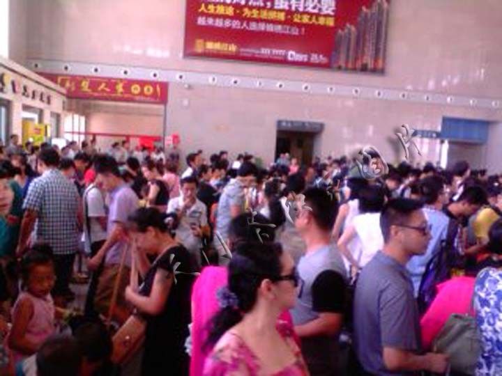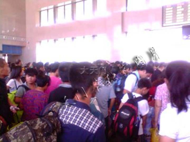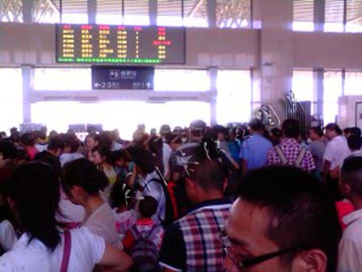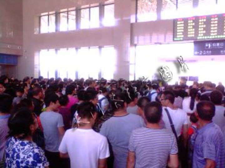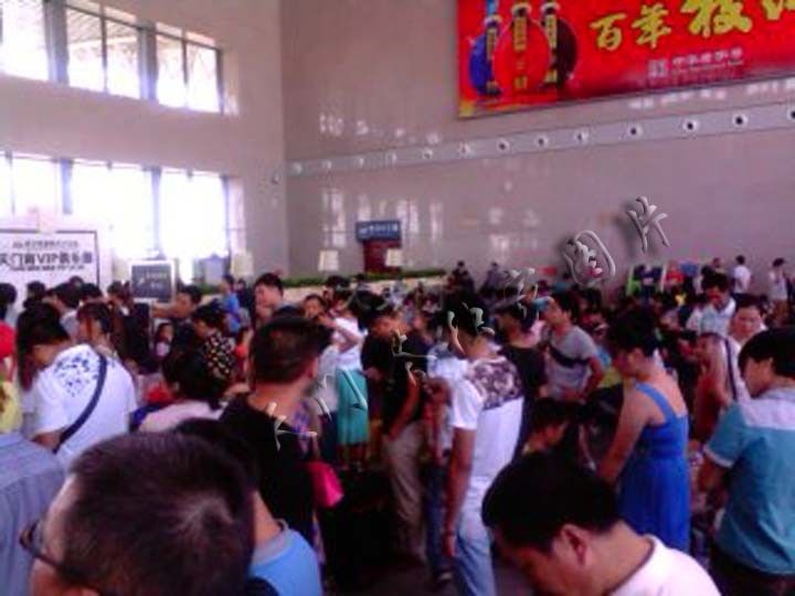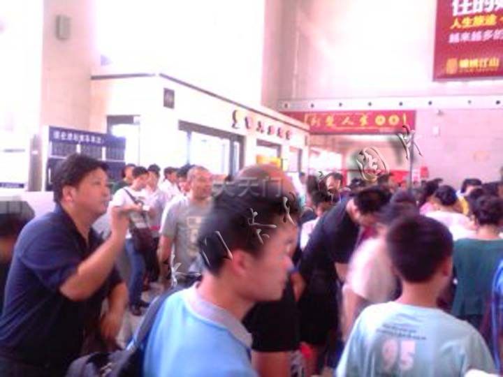 D5802从天门南是13 :57开车,我们13 :30分就到达了南站,先到售票厅将车票打印出来,来到入口(现在入口已经搬到候车大厅门外来了),入口处还有很多人在排队验票,进入候车大厅,我被眼前的景象惊呆了,候车大厅里到处都站满了人,候车大厅原来有两台安检机,东边的安检机(忆停运)上都站着人,在大厅里想前进一步都非常困难,这时我心里想,难怪网民说天门南的候车厅一建就小了,我想再扩建它个二、三倍也不见大。因为现在你不想奢望有个什么座位,就算有个站的地方都不错了。