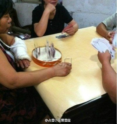 大妈,你这也太有创意了,一只胳膊还打牌,里面放的是神马?~