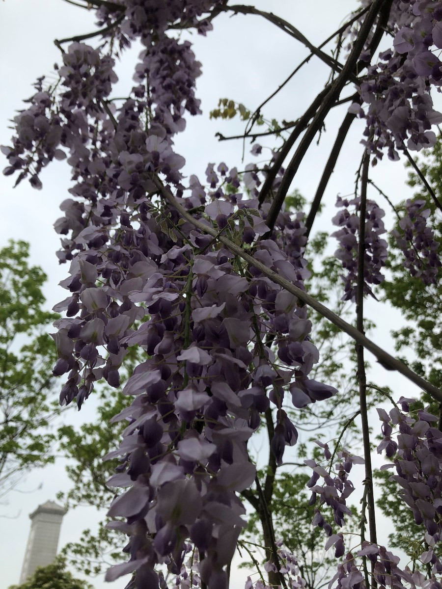 今天中午,我和同事到植物园散步,发现了一株紫藤花。她的花瓣顶端是紫色的,越往下越淡,到了底部,就成了乳白色,像牛奶一样;花冠是蝶形的,像一只只翩翩飞舞的蝴蝶……于是拿出手机照了几张,与网友们一起分享。请看组图——